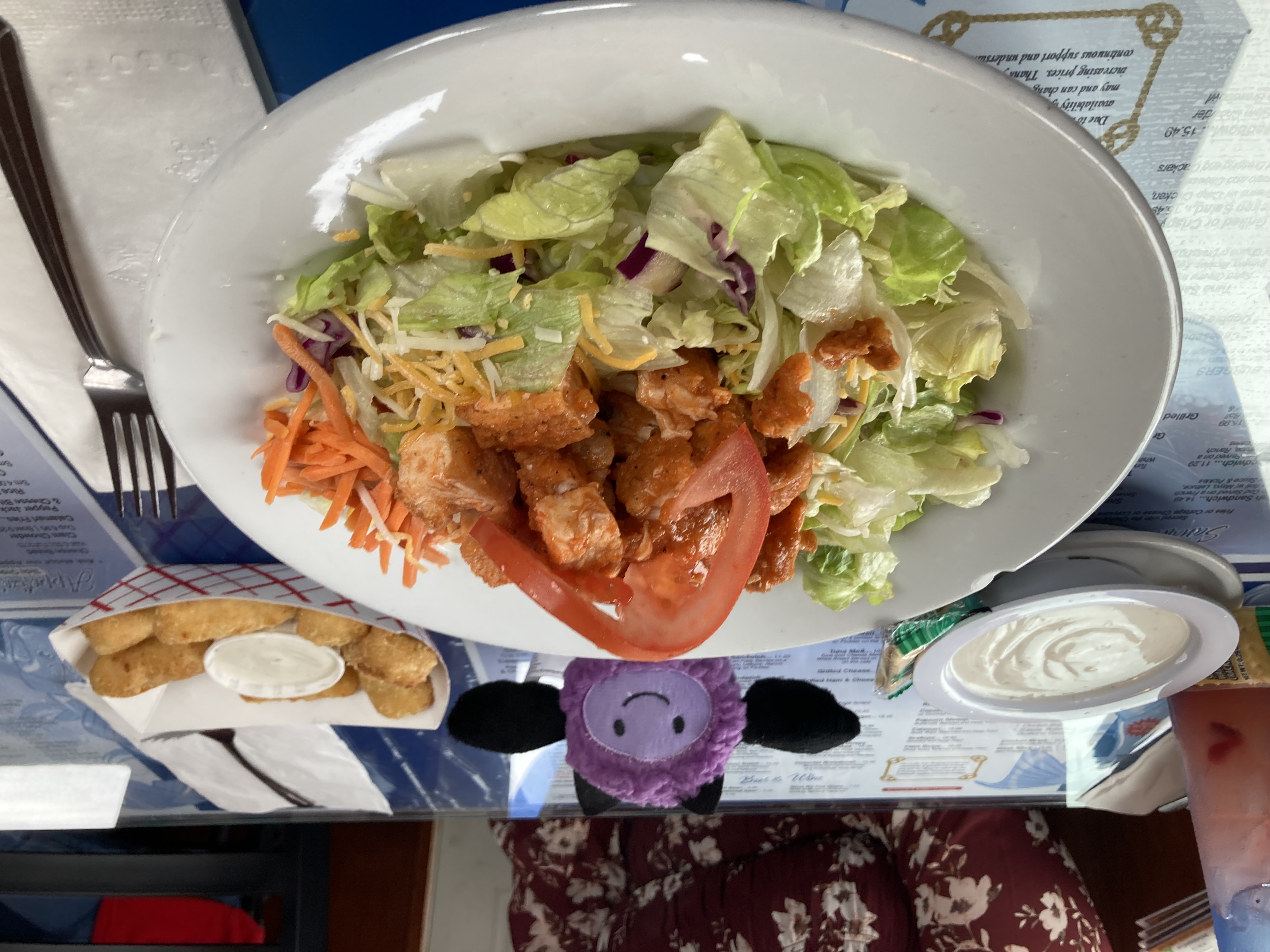 Reviewer 3 enjoyed a very satisfying meal as well. The Pepper Jack Mac and Cheese Bites were the highlight, described as creamy on the inside with a perfectly crisp coating on the outside. Reviewer 3 said these will absolutely be ordered again as a future appetizer. The Buffalo Chicken Salad was fresh, with chicken that carried a mild spice that paired well with the rest of the ingredients. Reviewer 3 also praised their waitress, Tammy, who offered excellent service and helped make the meal relaxing and pleasant.