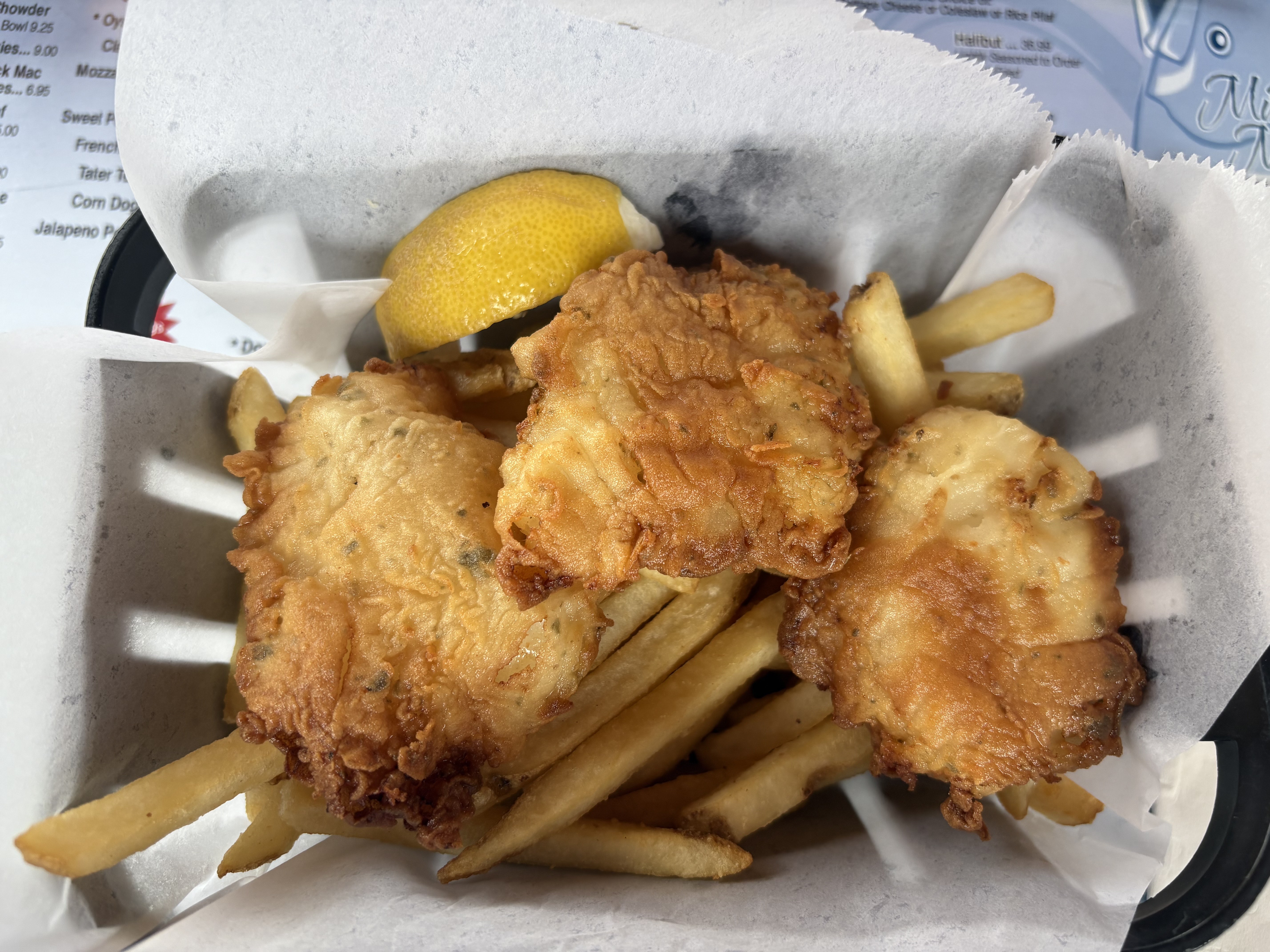 Reviewer 2 spoke highly of the fish and fries. The cod arrived golden and flaky. The cocktail sauce was a pleasant pairing and added just the right amount of zing. Reviewer 2 also remarked on how friendly and knowledgeable the staff was, making the entire experience smooth and enjoyable. The menu was large with plenty of options for guests who prefer something other than seafood.