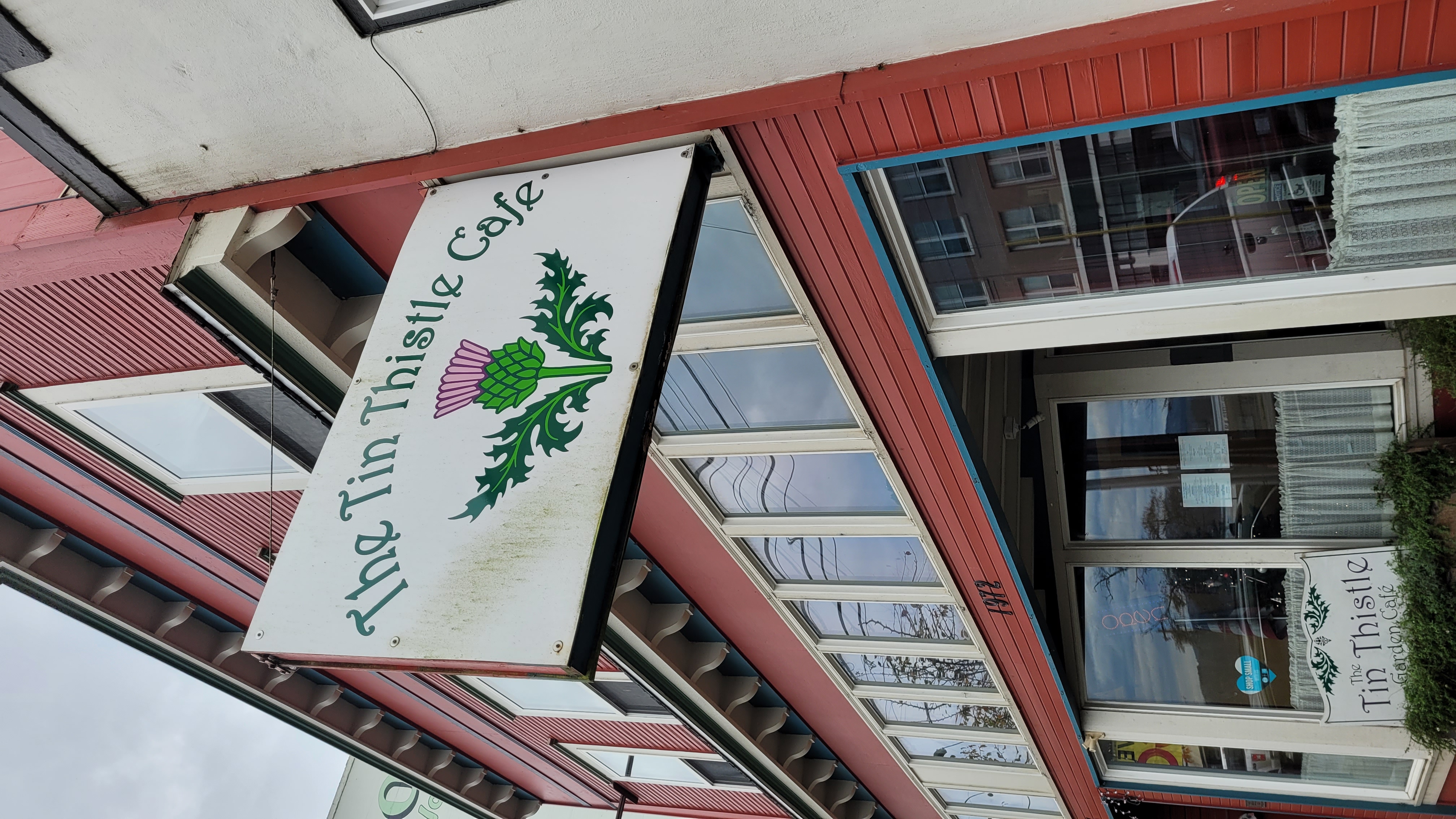 During our visit, we had the pleasure of being served by Paula Holmes, the owner of The Tin Thistle Café. She shared that the handcrafted tables and benches used in the outdoor seating area were built by her husband, Steve Holmes, who also operates a neighboring storefront, The Wood Anvil, where his woodworking pieces are displayed and sold. This personal touch adds to the café’s sense of community and craftsmanship, making it feel truly one of a kind.