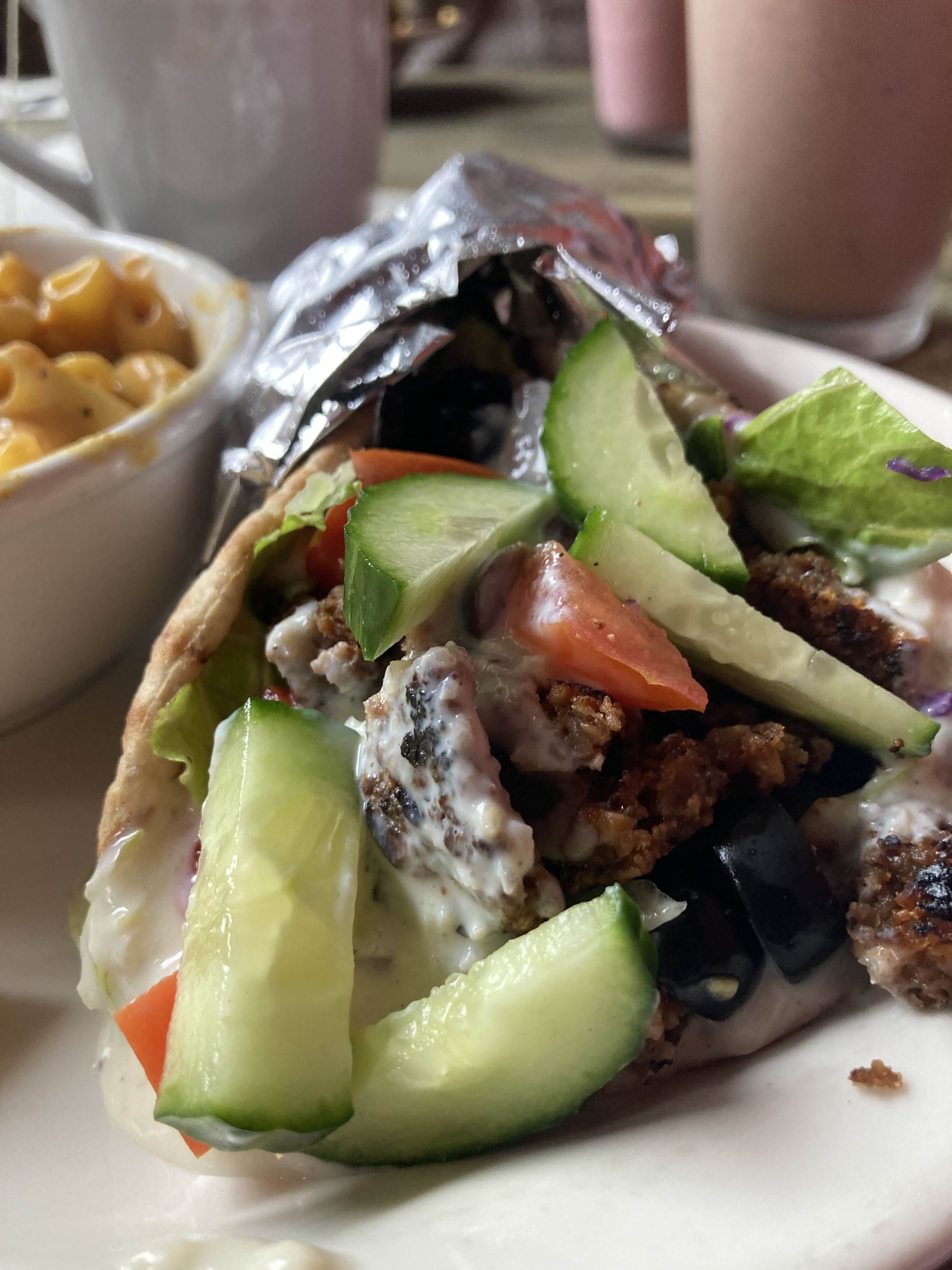 Another reviewer opted for the Gyro Pita, mac and cheese with sriracha, a PB&J smoothie made with almond milk, and orange spice tea. The gyro pita was packed with fresh vegetables and savory flavor, while the mac and cheese delivered a noticeable kick thanks to the sriracha. The smoothie lived up to its name, tasting just like a classic peanut butter and jelly sandwich in drinkable form, and the tea was a comforting addition on a cloudy day.