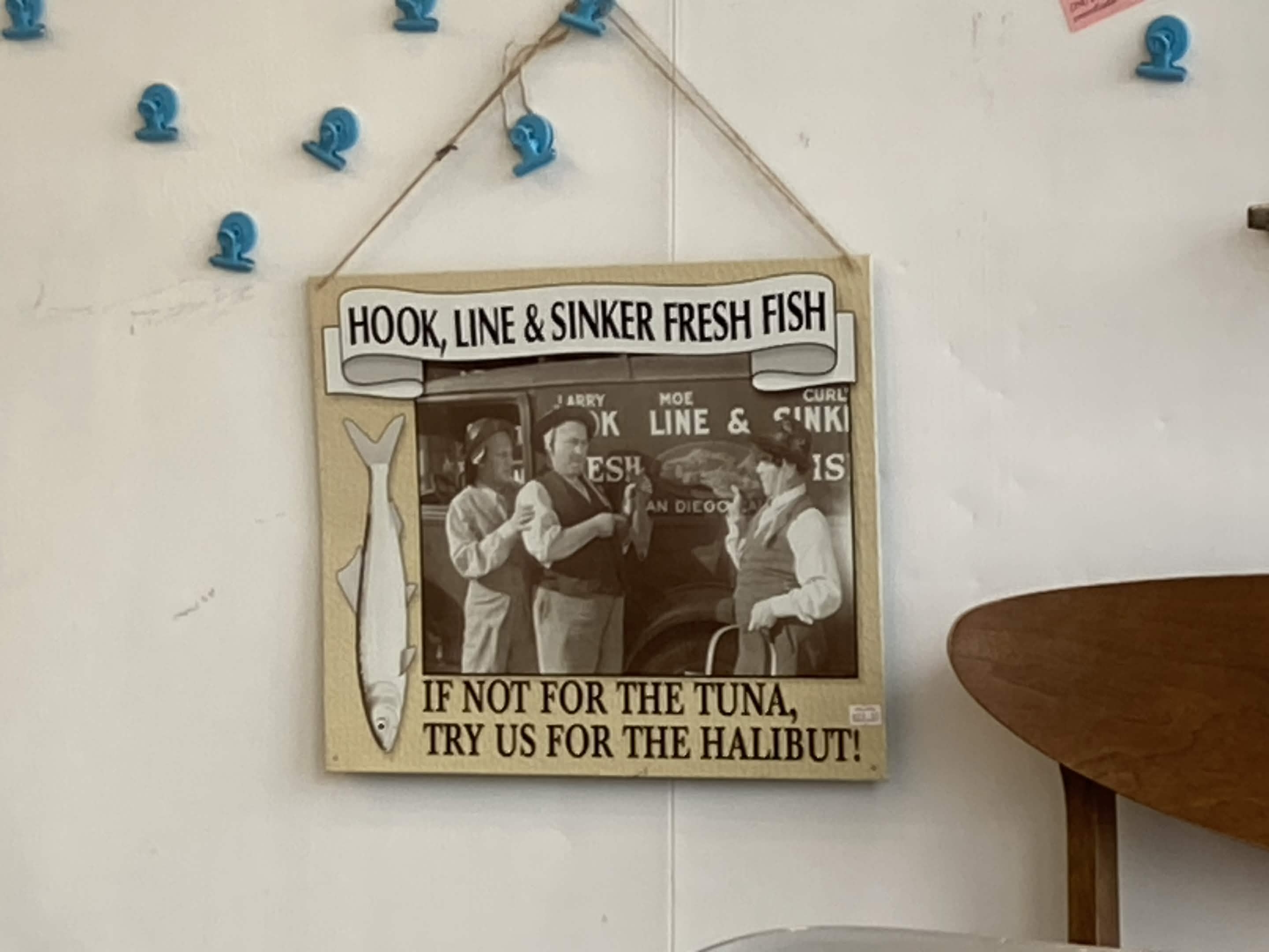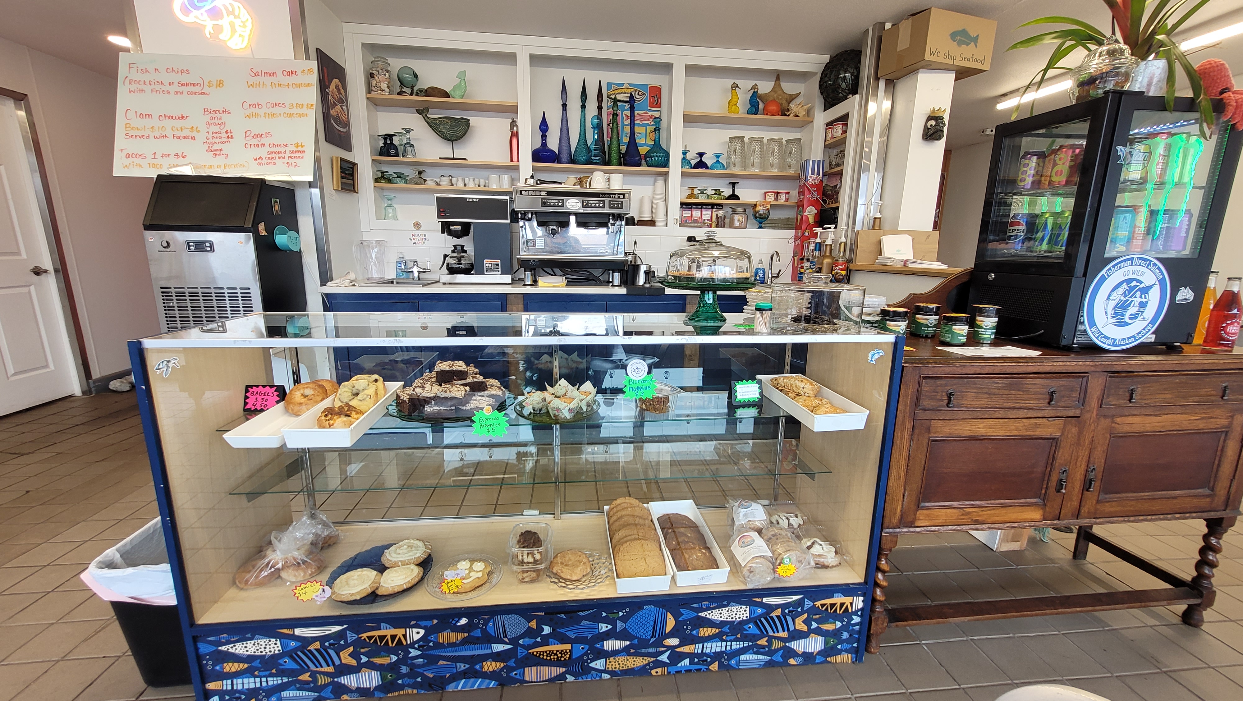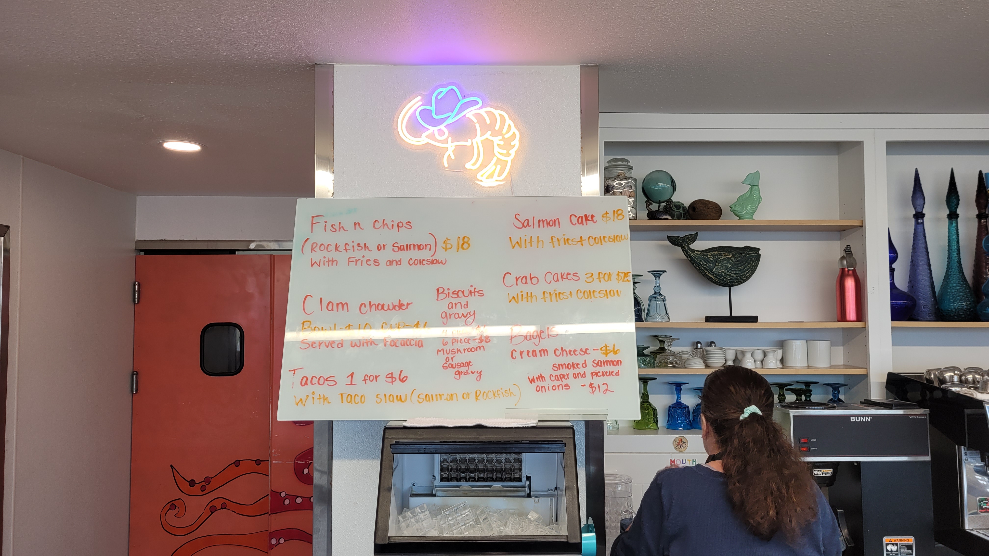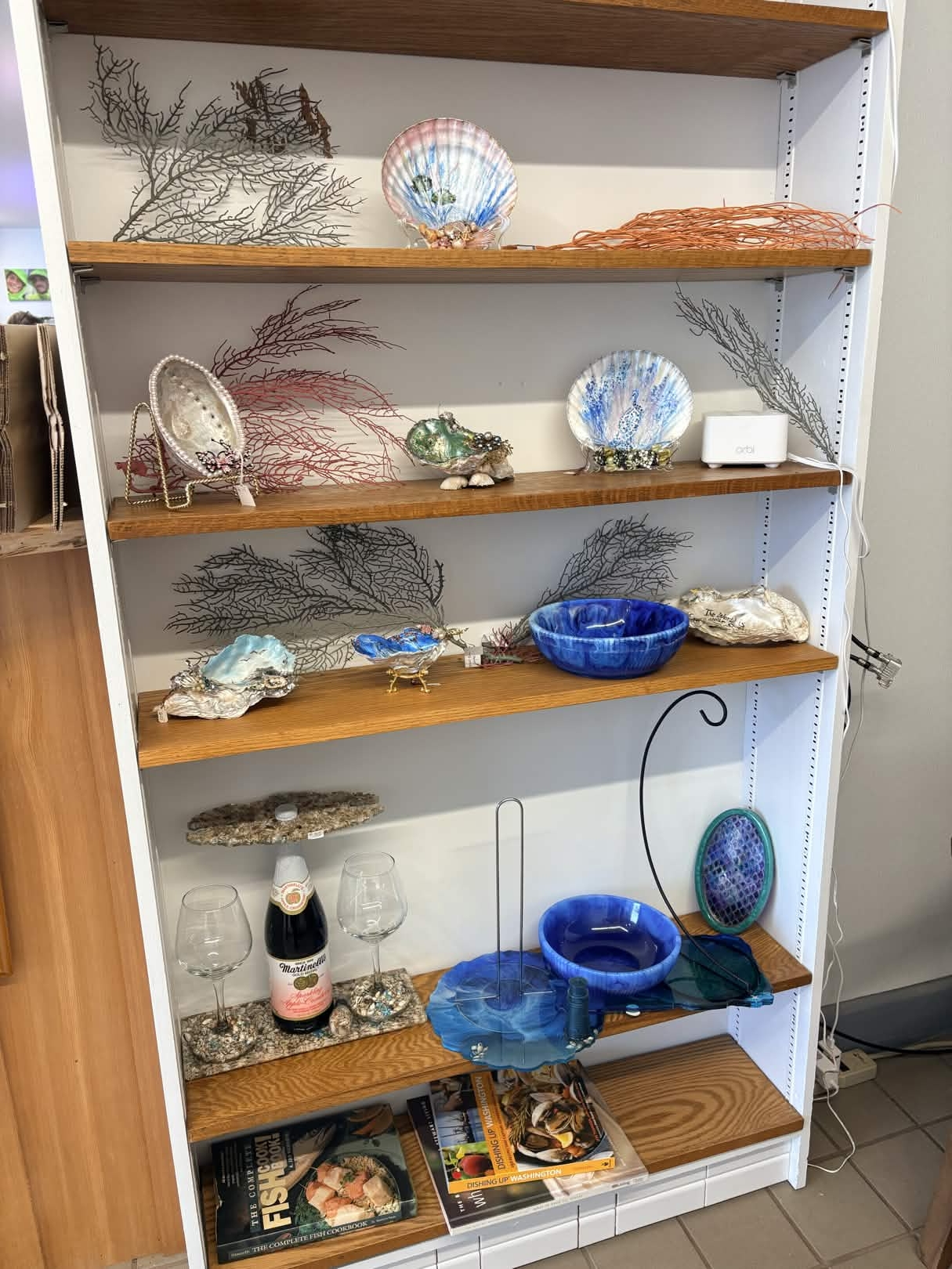 Before stepping inside, visitors are greeted by a beautiful mural and a clean, welcoming entrance. Once inside, we were warmly greeted by the staff as well as a few friendly patrons already enjoying their meals. The interior is charming and full of coastal character. Guests can see a display of seafood available for purchase along with other items including locally made trinkets and even treats for your favorite pup. The décor features fun artwork that adds to the relaxed seaside atmosphere.