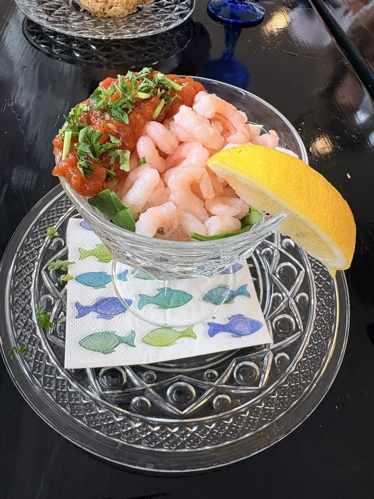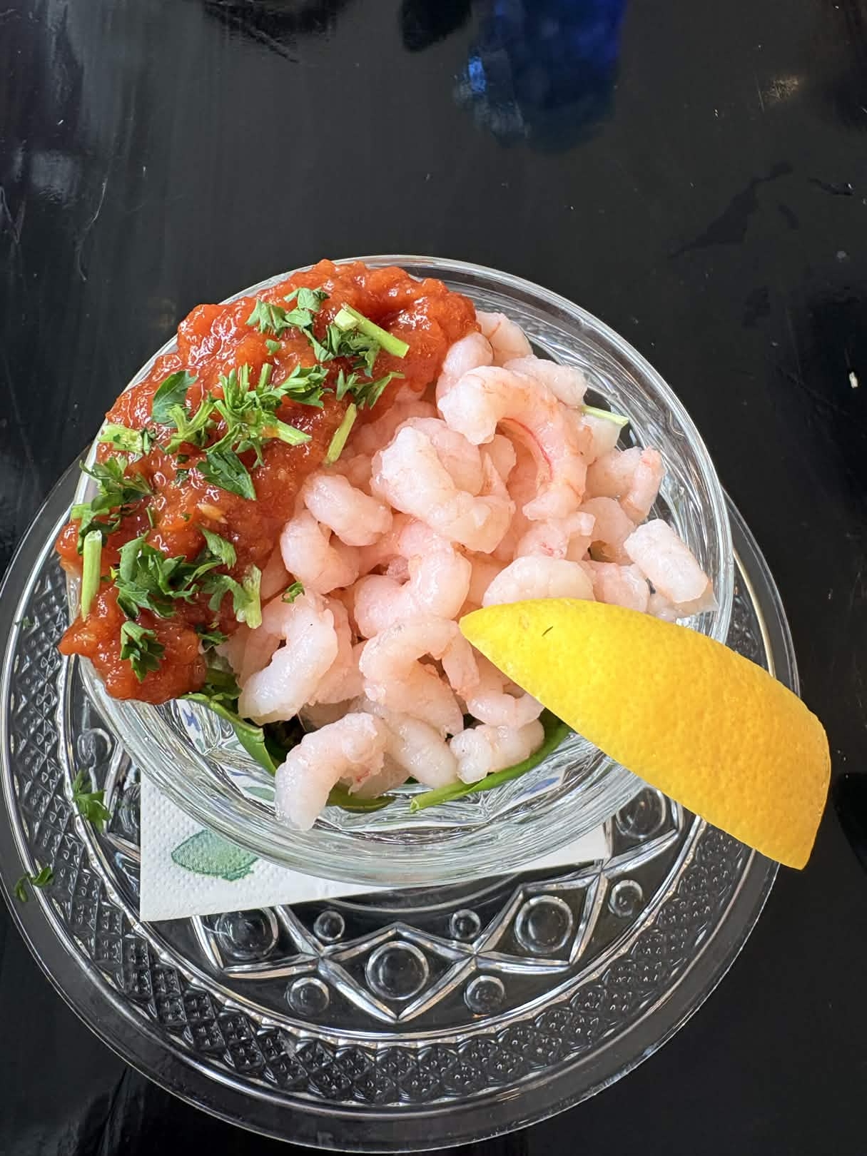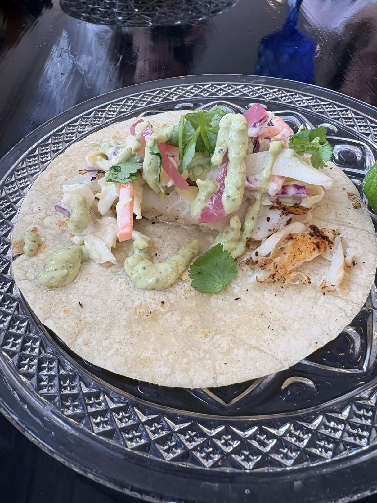 Reviewer number two ordered the lingcod fish taco along with a shrimp cocktail. The taco featured tender grilled fish topped with pickled onions, crunchy coleslaw, and a creamy herb crème that gave the dish a bright and balanced flavor. The shrimp cocktail was another highlight. The shrimp paired perfectly with a cocktail sauce that had just the right kick. This reviewer rated the sauce a ten out of ten.